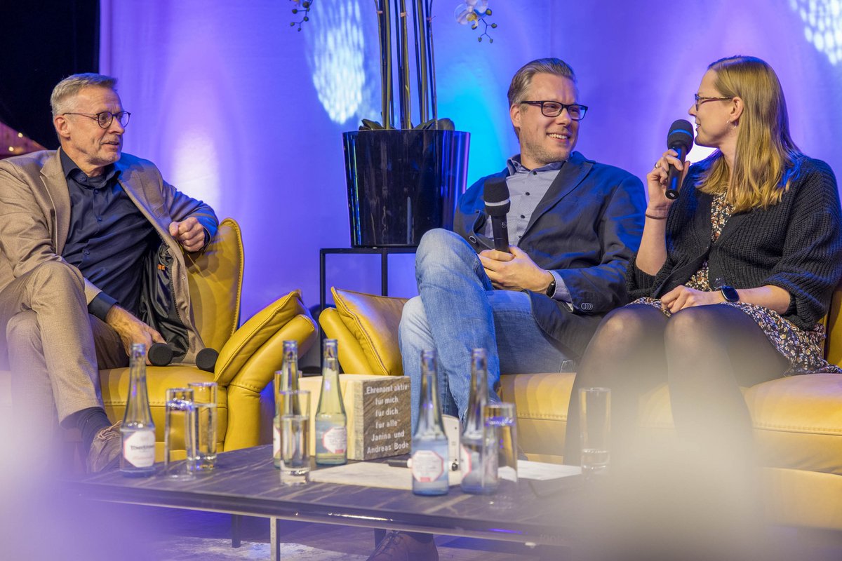 Reden schwingen mussten sie dann auch nicht – ein paar Fragen hatte Christian Böwer, der die Ehrenamtsgala moderierte, aber dennoch an die frisch gekürten Preisträger. So erklärten sie in lockerer Gesprächsrunde, dass sie zwar viel im Hintergrund arbeiten, aber in den Rollen der Trainerin und des Vize-Präsidenten auch mal in der ersten Reihe stehen würden. „Die Mischung macht‘s“. Geprägt in Sachen Ehrenamt seien sie schon durch ihre Eltern, die sie jetzt in deren Ruhestand wieder zurück ins aktive Engagement holt hätten, verriet Janina Bode. „Wir hatten im Kolping-Vorstand eine Vakanz. Da habe ich meine Mutter mal des Öfteren gefragt, ob das nicht etwas für sie wäre …“. Und ihr Vater fahre jetzt den Bürgerbus. Sie hoffe, dass es auch auf ihre Kinder abstrahle. Diese seien zurzeit zumindest gut gelaunt immer mit dabei, ob beim Sport oder beim Müllsammeln nach dem Oktoberfest. Um alles zu organisieren brauche man jedenfalls einen gut strukturierten Kalender, erläuterte Andreas Bode, „am besten digital, damit er immer zur Hand ist.“ Am Wochenende seien viele Veranstaltungen und unter der Woche hätten sie jeweils zwei Tage für ihre jeweiligen Ehrenämter. „Und wenn mittwochs keine Kolping-Vorstandssitzung ist, haben wir auch mal einen Abend für uns.“