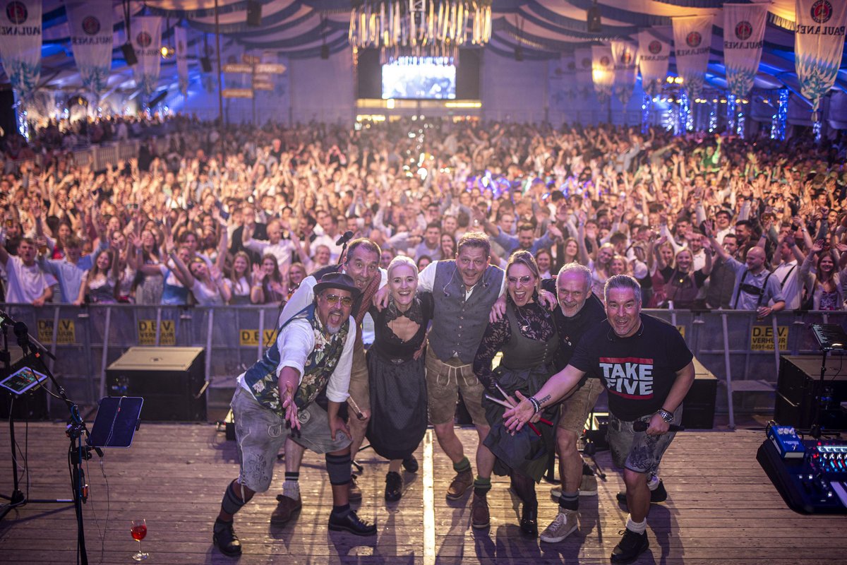 Nach ihrer fulminanten Premiere vor zwei Jahren rockte die Münchner Band Take Five wieder das Zelt in Hollage. Verstärkt mit doppelter Frauenpower an den Mikrofonen zogen die fünf Musiker die stilecht in Dirndl und Lederhosen gekleideten Gäste auf die Tanzfläche oder animierten sie an den Tischen und in den Wiesnboxen kräftig mitzufeiern.